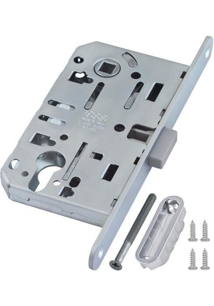 Стандартная установка межкомнатной двери проводится в подготовленном проёме и включает в себя: сборку и установку коробки, врезку двух петель, врезку ручки с защёлкой (врезка сложного замка оплачивается дополнительно), установку наличника с двух сторон на шпильки, расходный материал. Пена из расчета один балон на 2 межкомнатных двери.